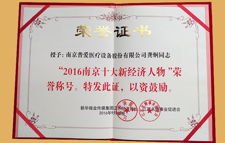 憑借著強(qiáng)烈的危機(jī)意識(shí),前瞻性視野,普愛醫(yī)療總經(jīng)理龔炯女士帶領(lǐng)著公司全員走出了一條轉(zhuǎn)型升級(jí)的崛起與發(fā)展之路。 2016年9月28日,普愛醫(yī)療總經(jīng)理龔炯女士榮獲2016南京十大新經(jīng)濟(jì)人物榮譽(yù)。